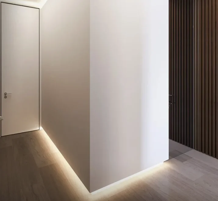 Скрытые плинтусы (или системы скрытого монтажа) становятся все более популярными в 2025 году. Они позволяют создать эффект "невидимого" плинтуса, который полностью скрывается за отделкой стен. Это отлично подходит для минималистичных и высокотехнологичных интерьеров, где важна каждая деталь и ценится отсутствие лишних элементов. Такой вид плинтусов создает ощущение легкости и простора.