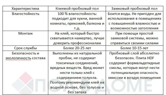 Все производители выпускают как клеевые, так и плавающие (замковые) пробковые полы. Причем оба вида можно часто найти в одном дизайне. Значит, для начала определяемся с конструкцией напольного покрытия. В этом поможет сравнительная таблица.