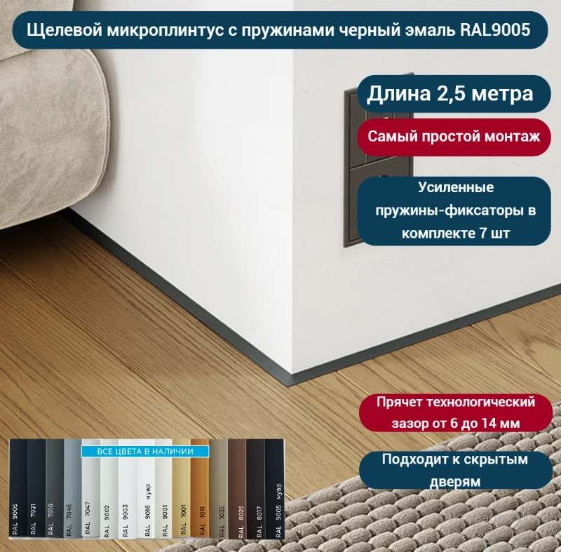 Стандартно микроплинтусы поставляются в ассортименте разных оттенков, а на заказ оттенок вообще может быть любым, например, подобранным в цвет пола.