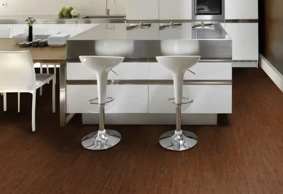 Клеевой пробковый пол на 100% водостойкий, поэтому может укладываться на кухне и в ванной комнате. Пробковый ламинат имеет HDF плиту, поэтому его монтаж прост, однако потоп не выдержит, а также нуждается в зазорах до стен.