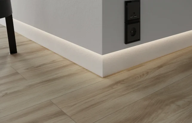 - Минималистичные решения со теневым плинтусом и парящими стенами. С помощью клеевого покрытия вы можете обойтись без зазоров между стенами и полами, что является сложной задачей при использовании плавающих полов.