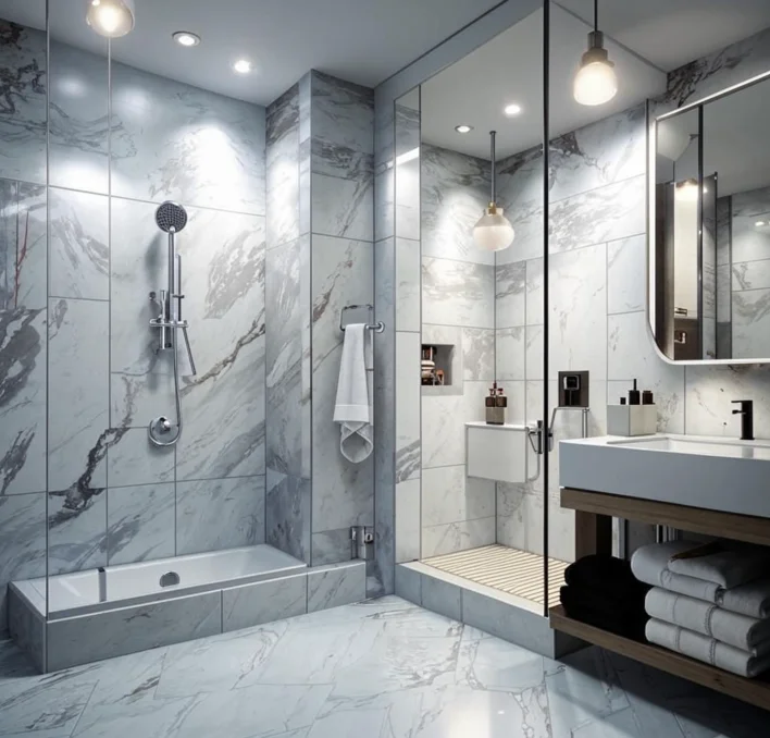 Ванная комната требует особого внимания к освещению, так как здесь часто приходится выполнять точные и важные задачи, такие как нанесение макияжа или бритье. Освещенность 200 люкс обеспечивает достаточный уровень света для всех этих нужд. Рекомендуется использовать яркие потолочные светильники и зеркала с встроенной подсветкой.