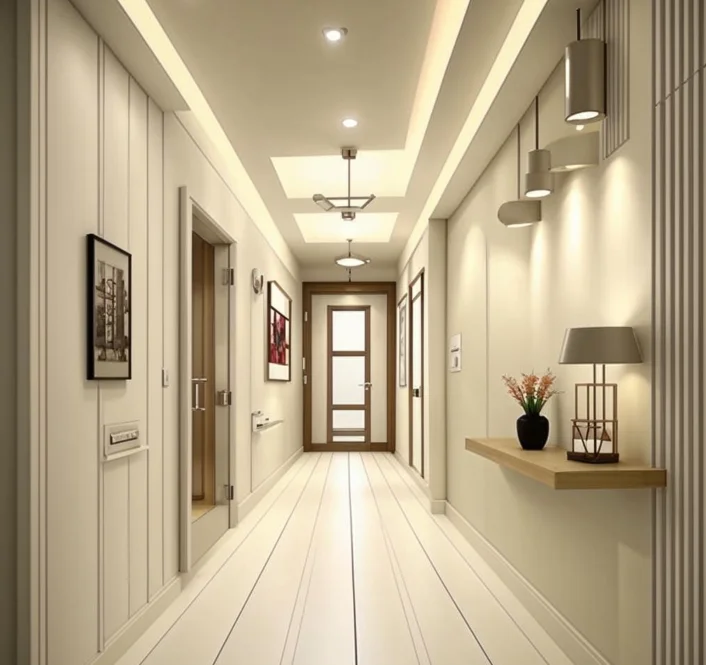 - Коридор: Хорошее освещение коридоров обеспечивает безопасность и создаёт приветливую атмосферу. Подойдут равномерно распределенные потолочные светильники.