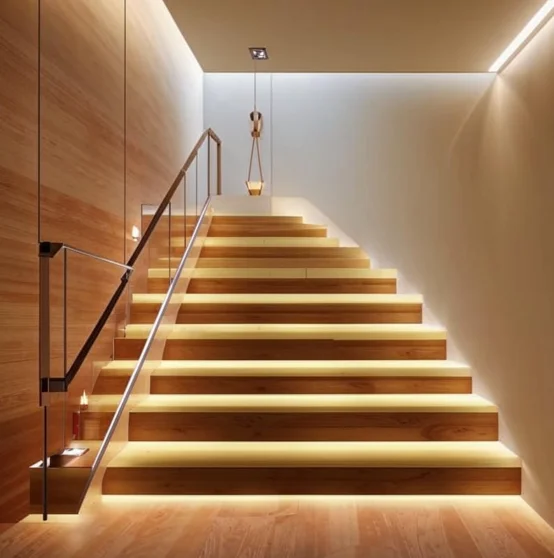 На лестницах освещение должно быть достаточно ярким, чтобы обеспечить безопасность передвижения, но при этом не создавать резких теней и бликов. Подойдут встроенные светильники в стенах или подступеях, создающие освещенность в диапазоне 20–50 люкс.