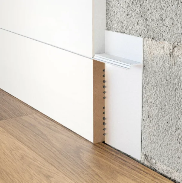 Монтаж скрытых профилей осуществляется в момент чернового ремонта до выравнивания стен. Профиль из алюминия приклеивается прямо на бетонное основание стены, а затем стены выравнивают гипсокартоном или штукатуркой. Плоскость стены выводится в один уровень с горизонтальной полочкой скрытого плинтуса, а под полочкой остается пространство. Это пространство закрывается вставкой из МДФ или дюрополимера. Ее можно окрашивать в цвет стен, пола, дверей, либо оставлять в белом цвете. Есть и варианты с имитацией древесины.
