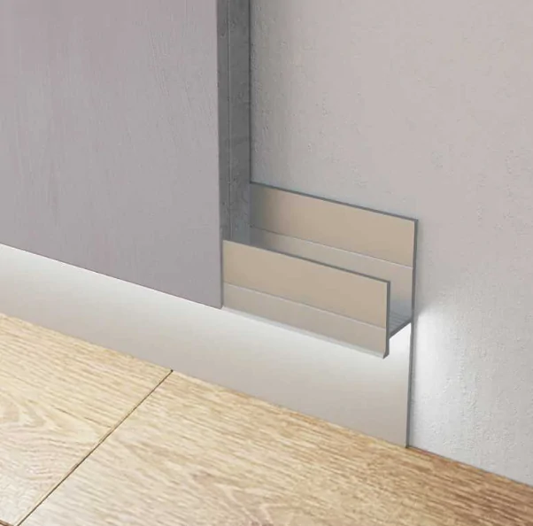Микроплинтус — это тонкий алюминиевый профиль, который закрывает зазор от напольного покрытия до стен. Находится в одной плоскости с полом и не выпирает. Г-образная форма совсем не находит на стены. L форма имеет заход на стены.