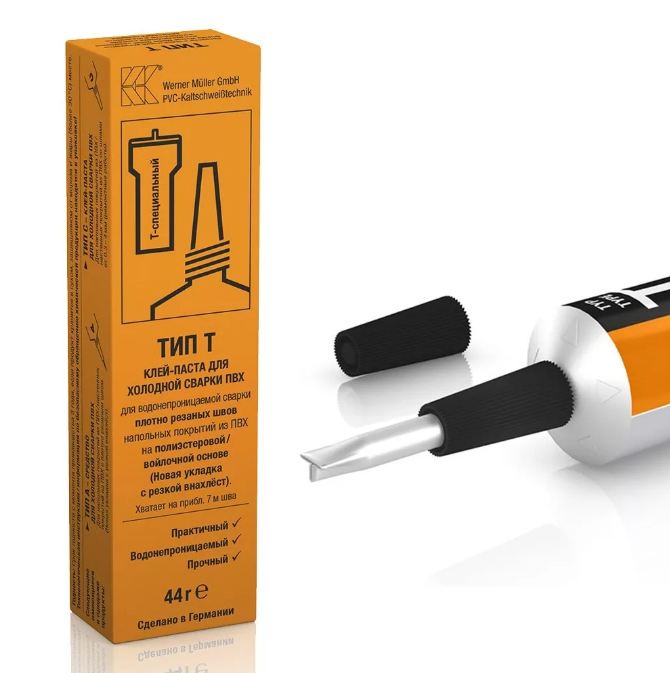 Клей Холодная Сварка для стыков напольного покрытия (бытовой, коммерческий, полукоммерческий линолеум на текстильной основе) при укладке со швом на сверхпрочное (бетон, природный и искусственный камень) и прочное (древесина) основание.