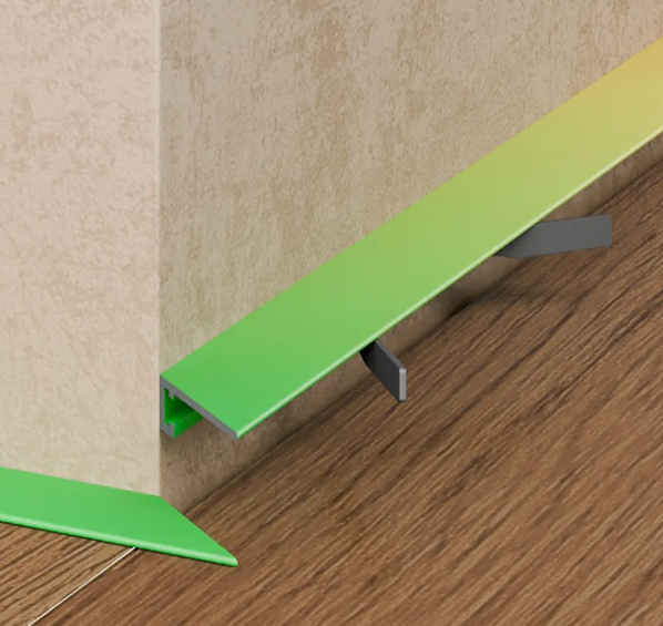 Для установки микроплинтуса не требуется креплений к стене. Монтаж производится на чистовой пол. Профили можно отпиливать под 90 градусов, чтобы получить нужную длину. В комплект входят пружины, которые можно подстроить под высоту шва.