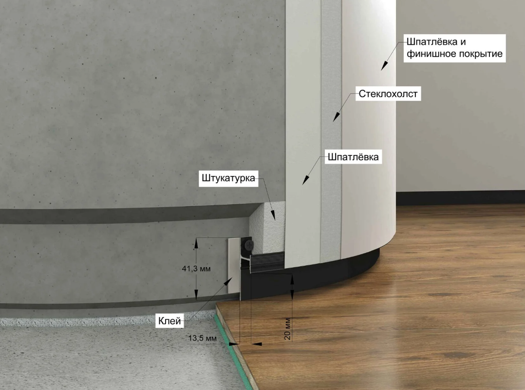Устанавливается на бетонное основание стены. Выполнен из алюминия, прочный. Станет незаменимым помощником при наличии в интерьере колонн, округлых ниш, криволинейных стен.