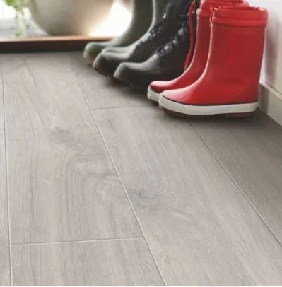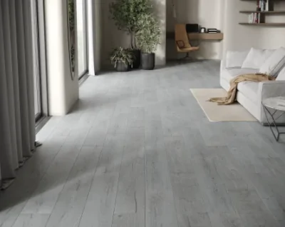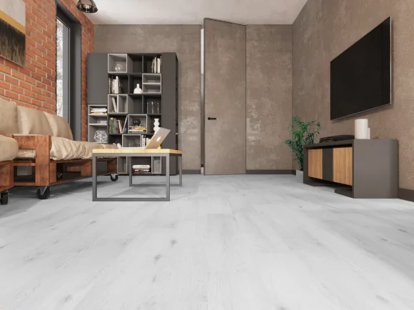 - Поможет добиться желаемых визуальных эффектов. Укладка серых длинных досок от входа к окну по направлению света вытянет помещение, если же комната и так длинная, расширить и укоротить ее визуально поможет поперечный тип раскладки. Светло-серые полы (например, ламинат SPC) добавят простора и света. Темно-серый пол плюс белый потолок и светлые стены визуально поднимут высоту помещения. Отдайте здесь предпочтение плинтусам под покраску, окрашенных в цвет стен.
