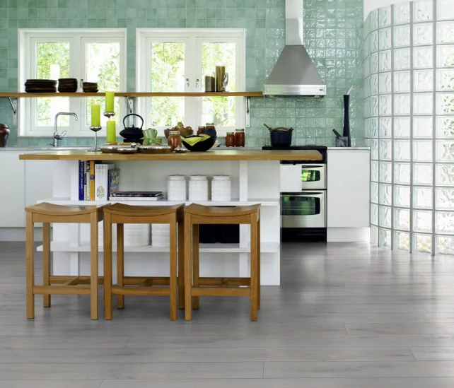 Натуральная паркетная доска, тонированная в серый оттенок — прекрасный выбор для домашних помещений. Выбор материалов, имитирующих древесину, также огромен — керамическая плитка, кварц-винил, ламинат, линолеум, пробковый пол.