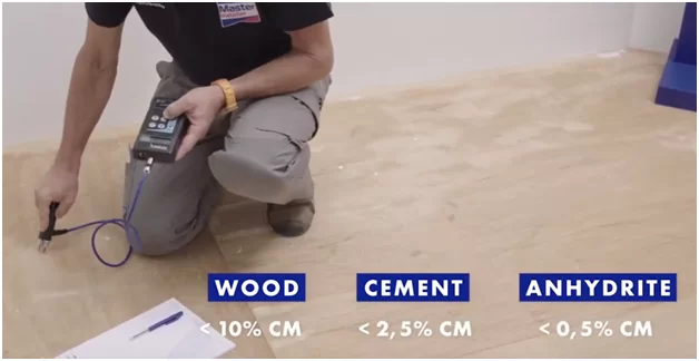 Влажность чернового пола должна быть менее 2,5% по методу CM / 75% по методу RH (цементная стяжка) или менее 0,5% по методу CM / 50% по методу RH (ангидритовое основание). Если имеется система подогрева, то рекомендуемая влажность, соответственно, не выше 1,5% и 0,3% по методу CM.