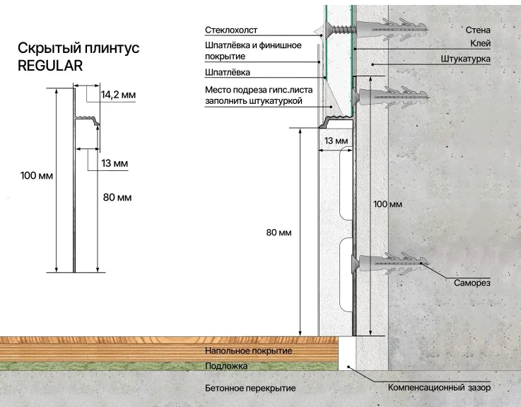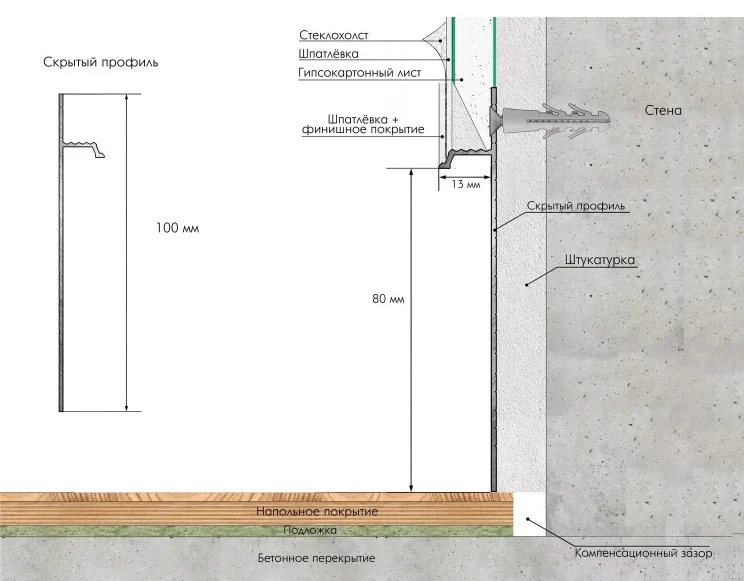 Этапы установки скрытого алюминиевого плинтуса