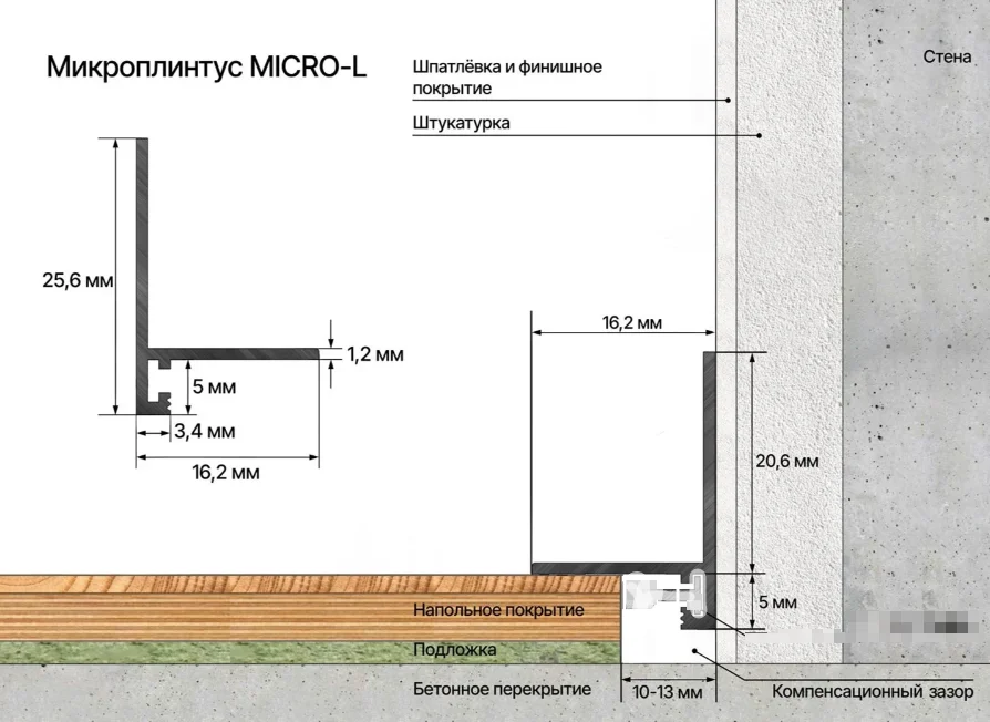 Если нет возможности выполнить эти требования, то рекомендуется приклеивать микроплинтус Laconistiq L к стене.
