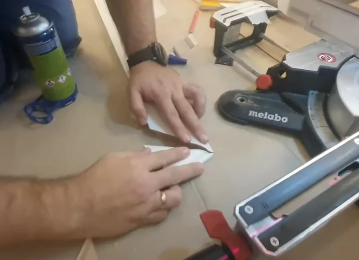 Обрезаем плинтус согласно правилу под углом в 45 градусов, а от другой части отрезаем треугольник окончание которого будет иметь отделку, приклеиваем треугольник к плинтусу, а далее производим монтаж на стену. Схема распила показана на фото ниже.