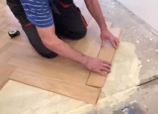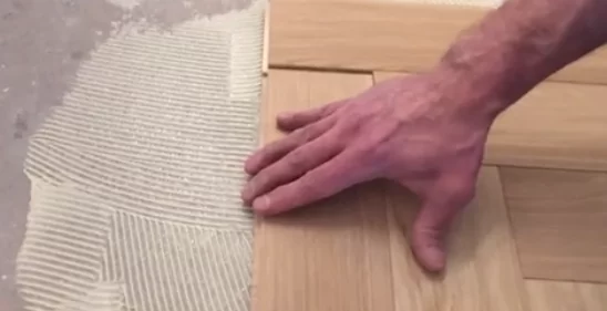 Намазываются небольшие участки, чтобы укладчик успел собрать пол данной площади и прижать каждую доску, пока не истекло рабочее время клея.